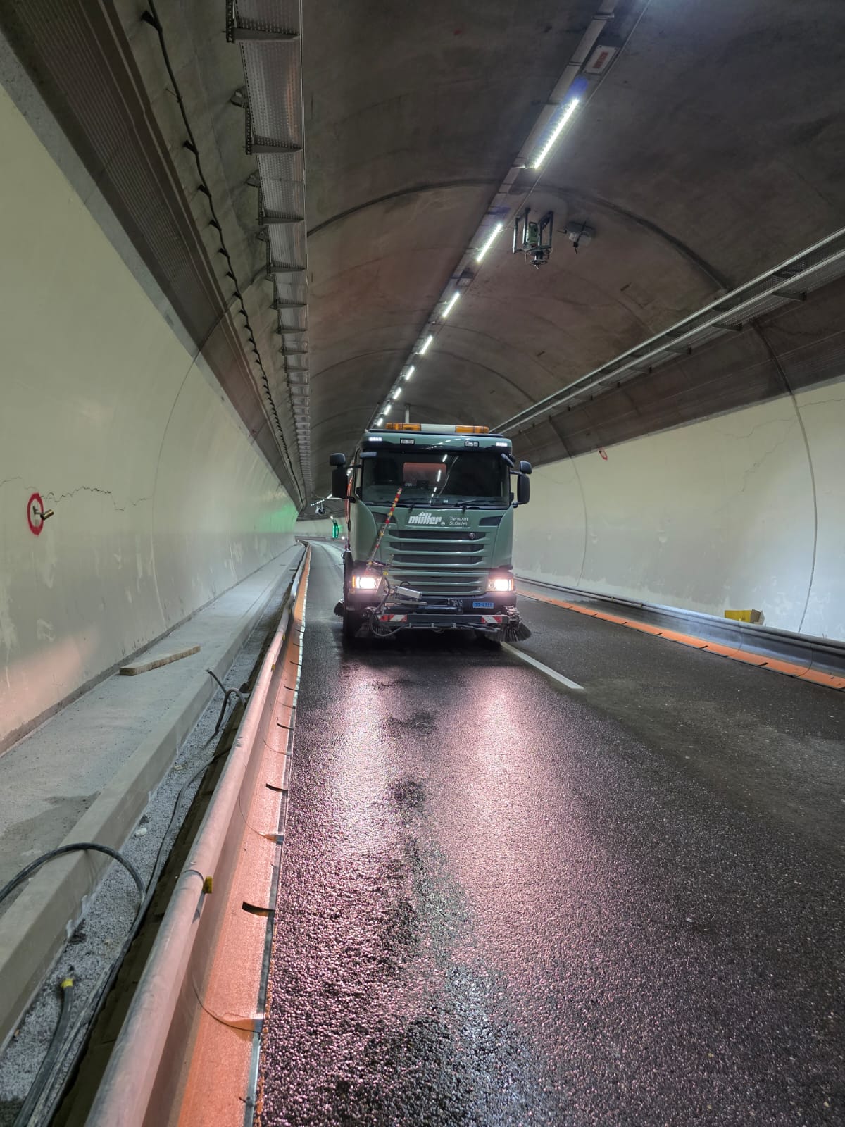 Während die Sanierungsarbeiten im Schoren-Tunnel laufen, sind wir von der Max Müller AG jeden Morgen mit unserer Wischmaschine unterwegs.